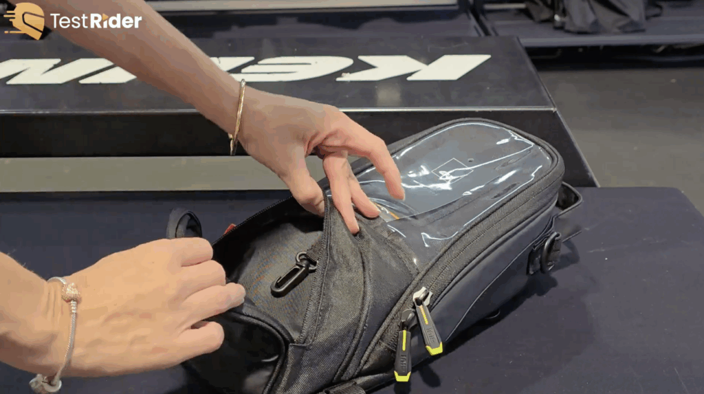 Ce qui marque d’abord l’utilisatrice, c’est la simplicité d’installation de cette sacoche. Grâce à la base aimantée, il suffit de la poser sur le réservoir, et l’accroche est immédiate.