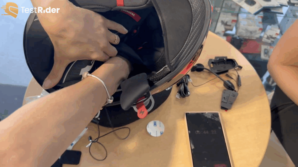 Nous avons privilégié le support à pince pour le module, plus pratique si l’on veut changer l’intercom de casque un jour, mais un support adhésif est fourni pour les coques trop épaisses. Il est crucial, et c’est un bon réflexe, de bien faire attention à cacher les fils pour qu’ils ne pincent pas ou ne gênent pas l’utilisateur.