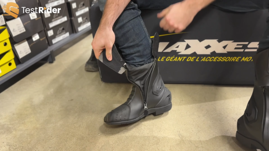 L’un des points forts soulignés par Charles est l’accessibilité de la botte. Grâce à son large zip latéral et son rabat velcro, l’enfilage est simple, même pour les motards ayant des mollets généreux.