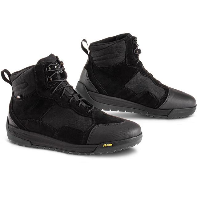 Baskets moto. Tige en suéde véritable et inserts textile “Air-Tech”. Membrane "High-Tex". Renforts pointe et talon. Inserts malléoles “D3O”. Fermeture lacets “Quick-lace” avec poulies. Semelle Vibram en caoutchouc bi-composant à haute adhérence.