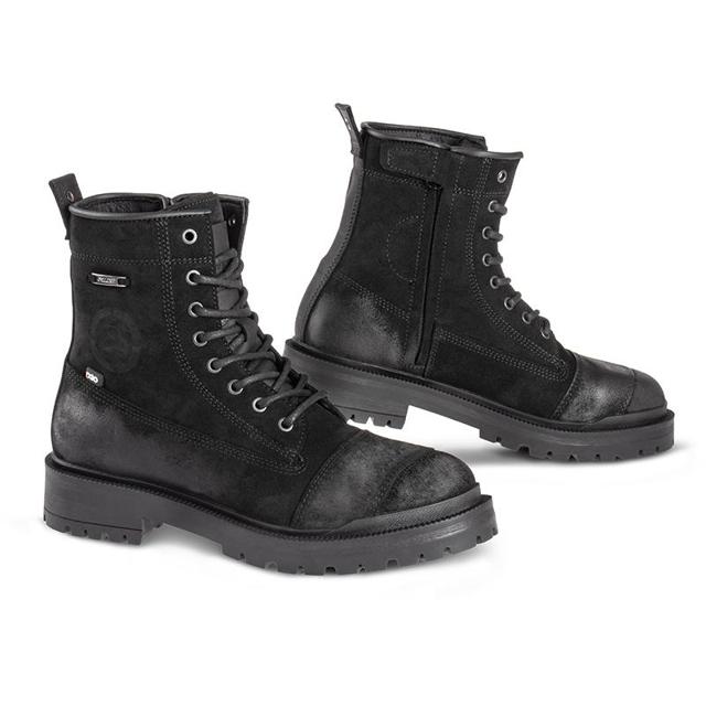 Bottines moto. Tige en cuir suède avec traitement hydrophobe et membrane "High-Tex". Renforts pointe et talon. Inserts malléoles “D3O”. Fermeture combinée par lacets et fermeture éclair. Semelle en caoutchouc à haute adhérence.