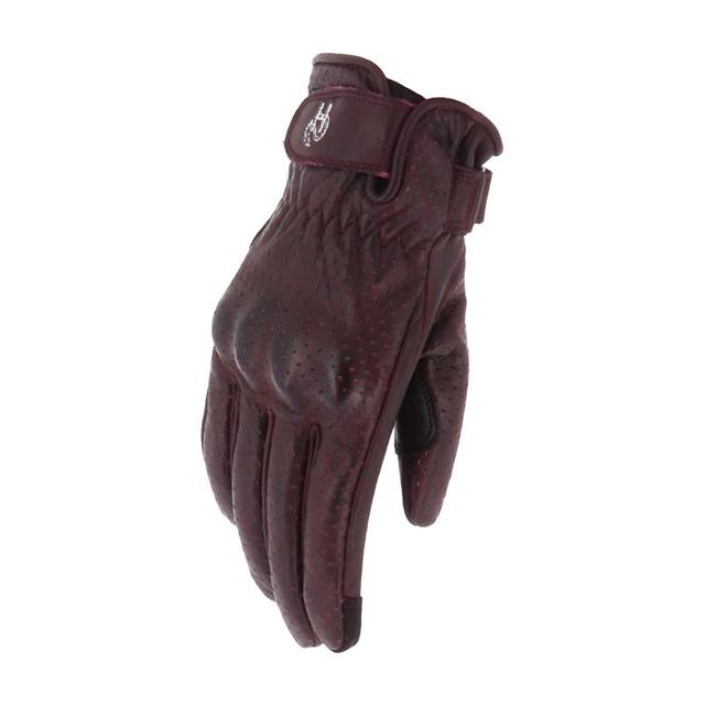 Gants été. Cuir de chèvre perforé. Manchette courte. Protection du poing par une coque carbone. Paume renforcée par des fibres aramides. Serrage poignet par velcro. Produit répondant à la norme CE niveau 1KP.