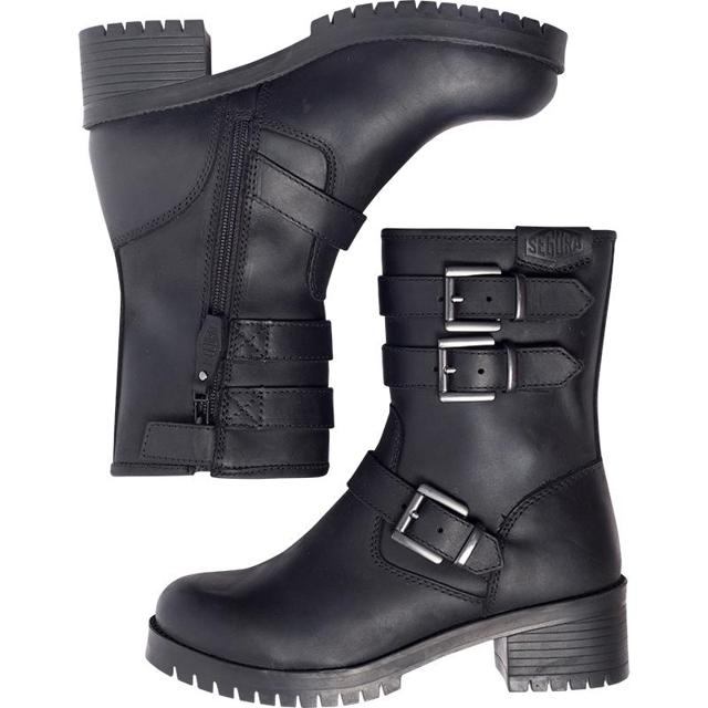 Bottines moto LADY CAMILLE 2, style biker, confort et protection. Conçues en cuir de vachette, durabilité et résistance, tout en affichant un look rock affirmé avec trois boucles métalliques. Zip latéral discret facilite l’enfilage, semelle intérieure Ortholite®, confort durable. Semelle à talon allonge la silhouette tout en garantissant stabilité à moto comme à pied. Protection renforcée grâce à la pointe et au talon renforcés, semelle anti-écrasement transversal. Traitement déperlant assure une résistance à l’humidité et aux éclaboussures. Homologuées CE EN 13634:2017.