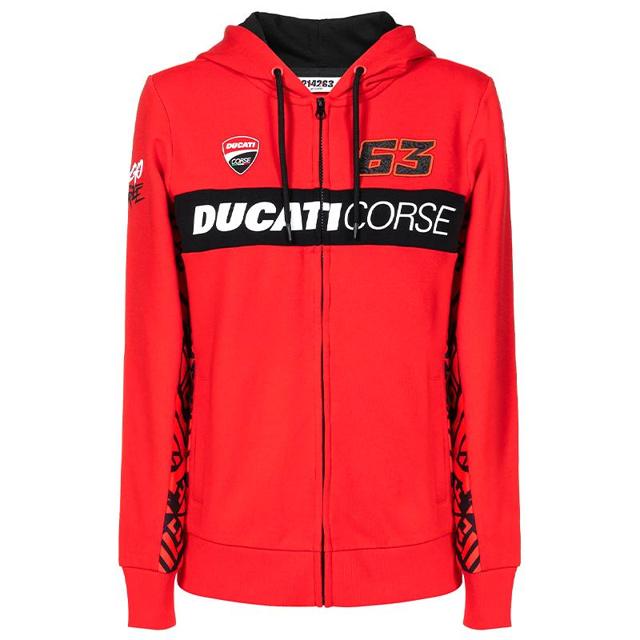 Le sweat-shirt, avec fermeture éclair complète et poches avant, présente le logo Ducati Corse imprimé et le numéro 63 sur le devant et le dos.